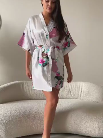 - Robe kimono feminino curto branco floral com visual delicado e sofisticado.