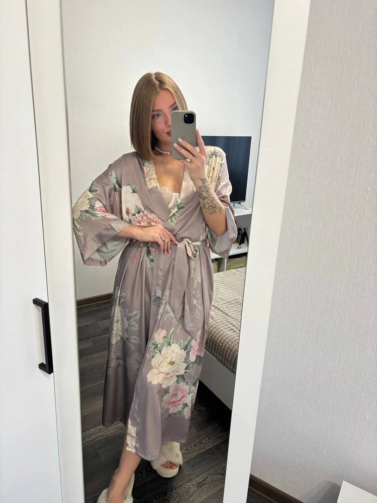Robe Kimono Longo de Cetim Lilás Floral Feminino