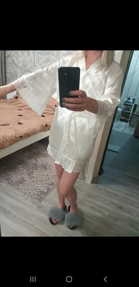 - Robe: modelo transpassado, mangas 3/4 com acabamento em renda delicada, detalhe em renda na barra.